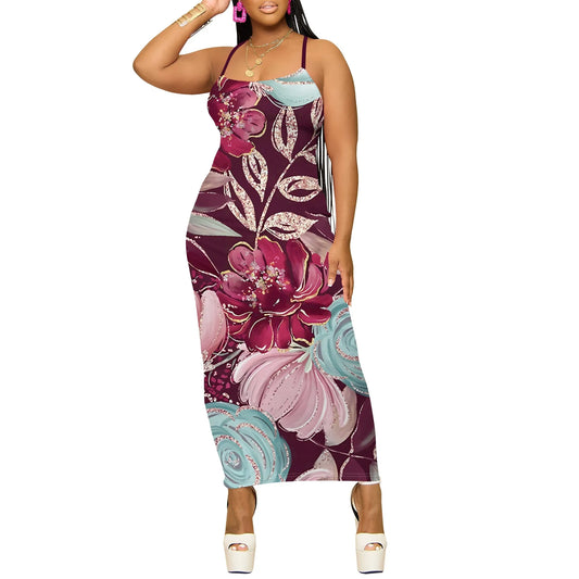 Vintage Floral Maxi Dress for Women Burgundy Spaghetti Strap Bodycon Sleeveless Summer Dress